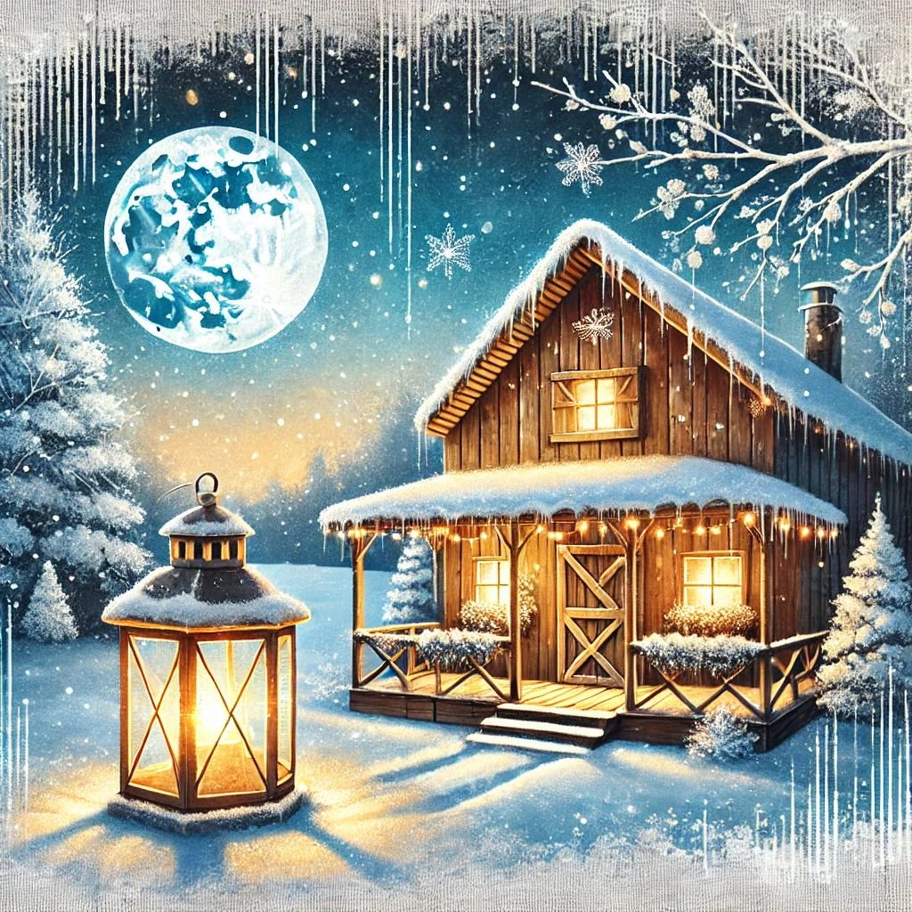 Featuring a snow-covered barn with icicles hanging from the roof and a vintage lantern surrounded by a light dusting of snow and warm glowing light, creating a cozy winter evening feel.